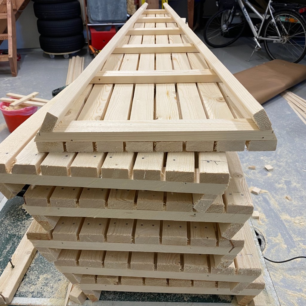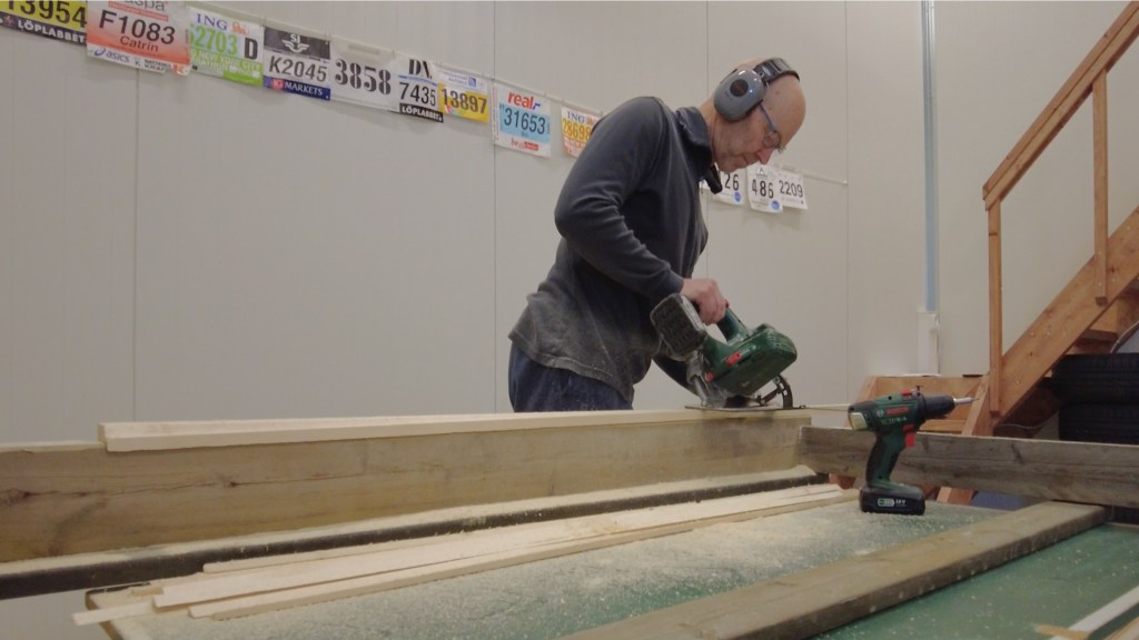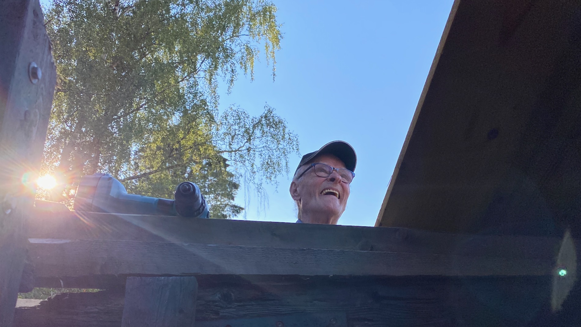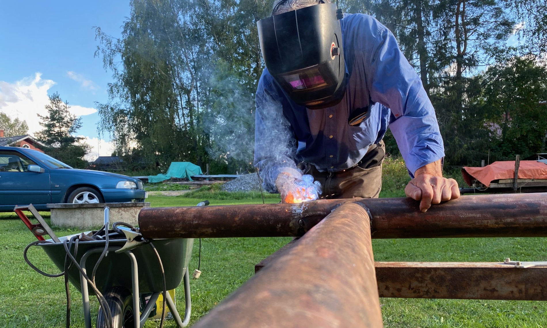 Ett av årets talkoprojekt var att lägga taket. Smedjan fick ett faltak. Med handöverfräs gjordes spåren i takbrädorna.