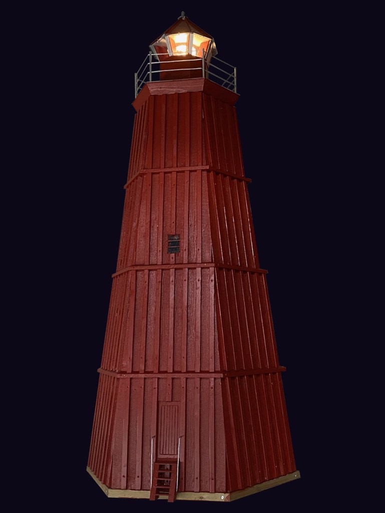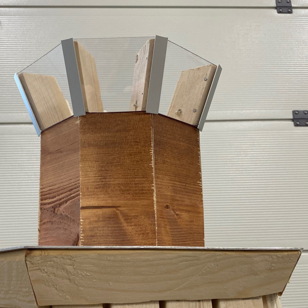 Fyren är sexkantig och smalnar av upptill. Lyktrummet är åttakantigt. En liten repetition i geometri krävdes nog innan de rätta måtten och vinklarna hittades. Det blev ett projekt som krävde lite kunnande i tre olika tekniker, träarbete, elektronik och plåtarbete. De två förstnämnda gick hyfsat lätt, medan taket var det som gav mest huvudbry. Jag fick lov att starta om några gånger innan jag fick till det. Att göra ett åttakantigt falsat plåttak, utan riktiga plåtverktyg, kan ha sin utmaning. Och bra blev det ju inte.