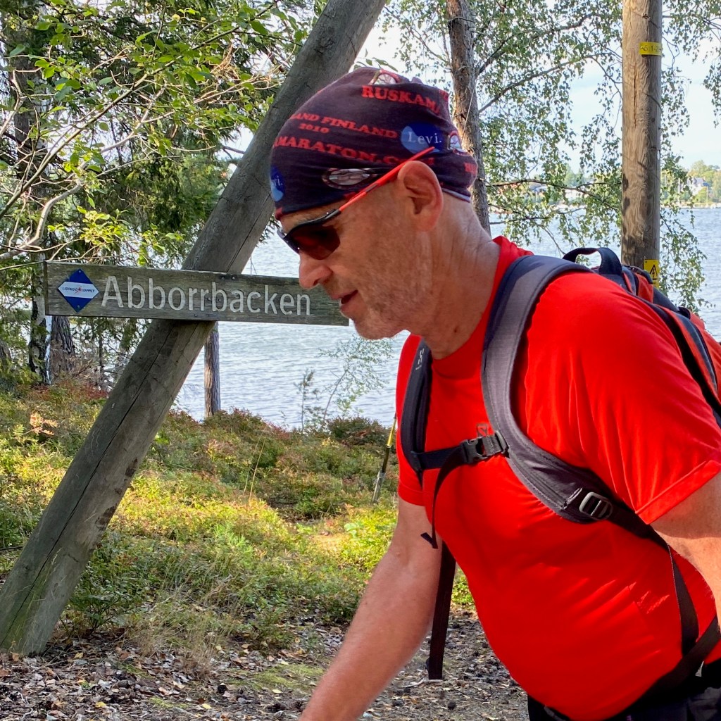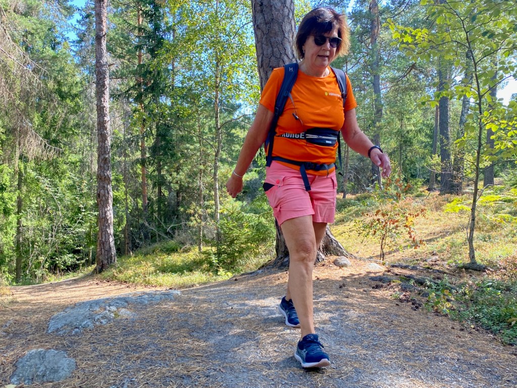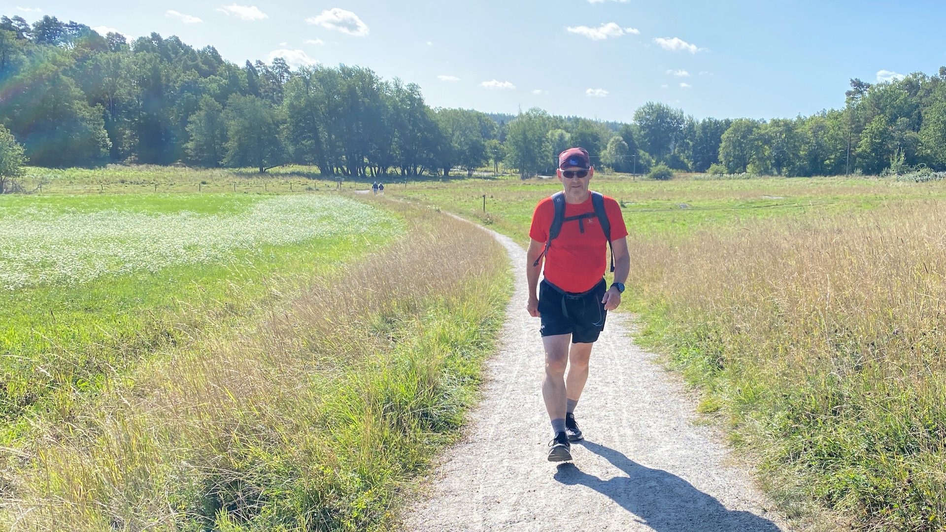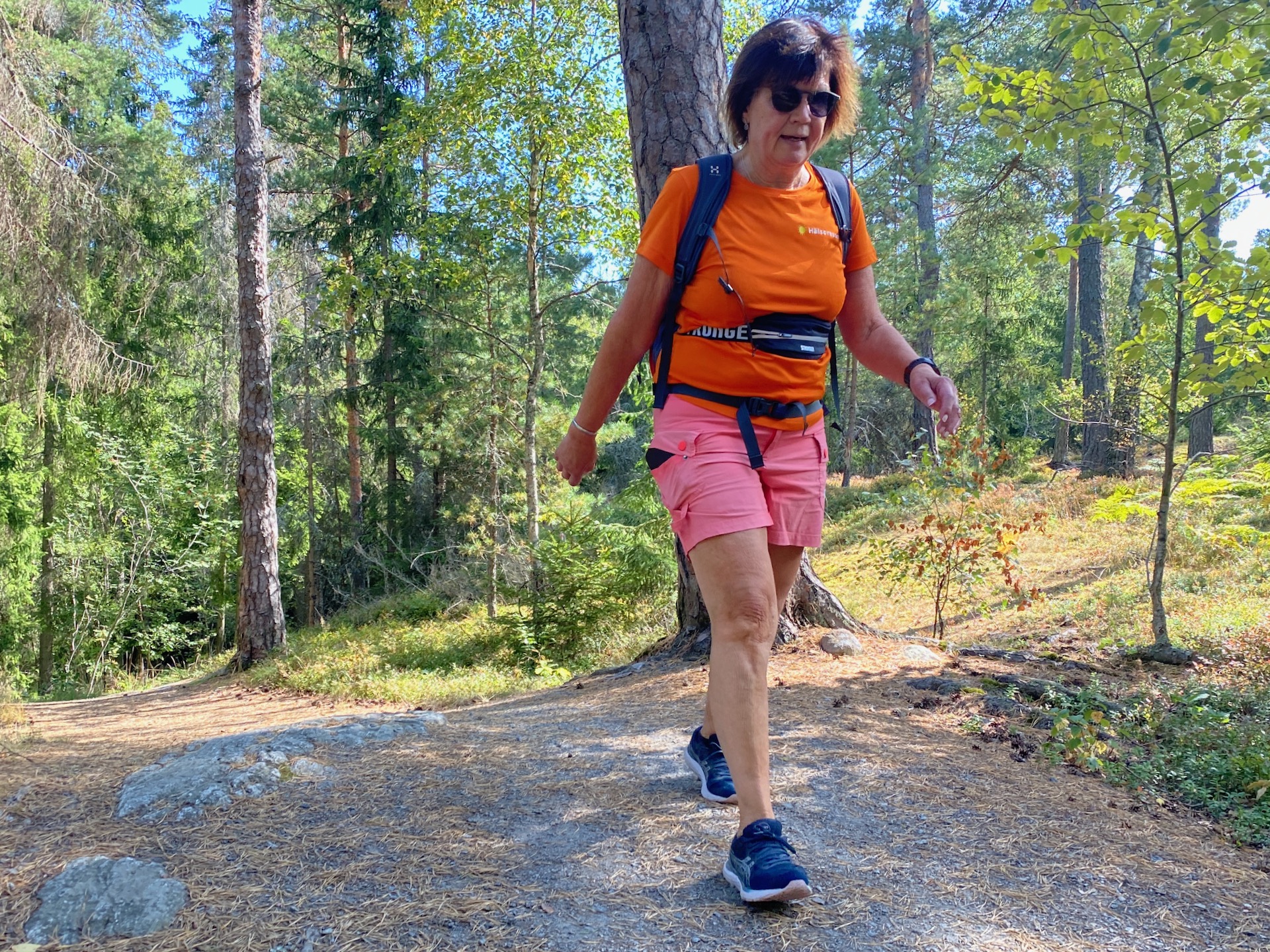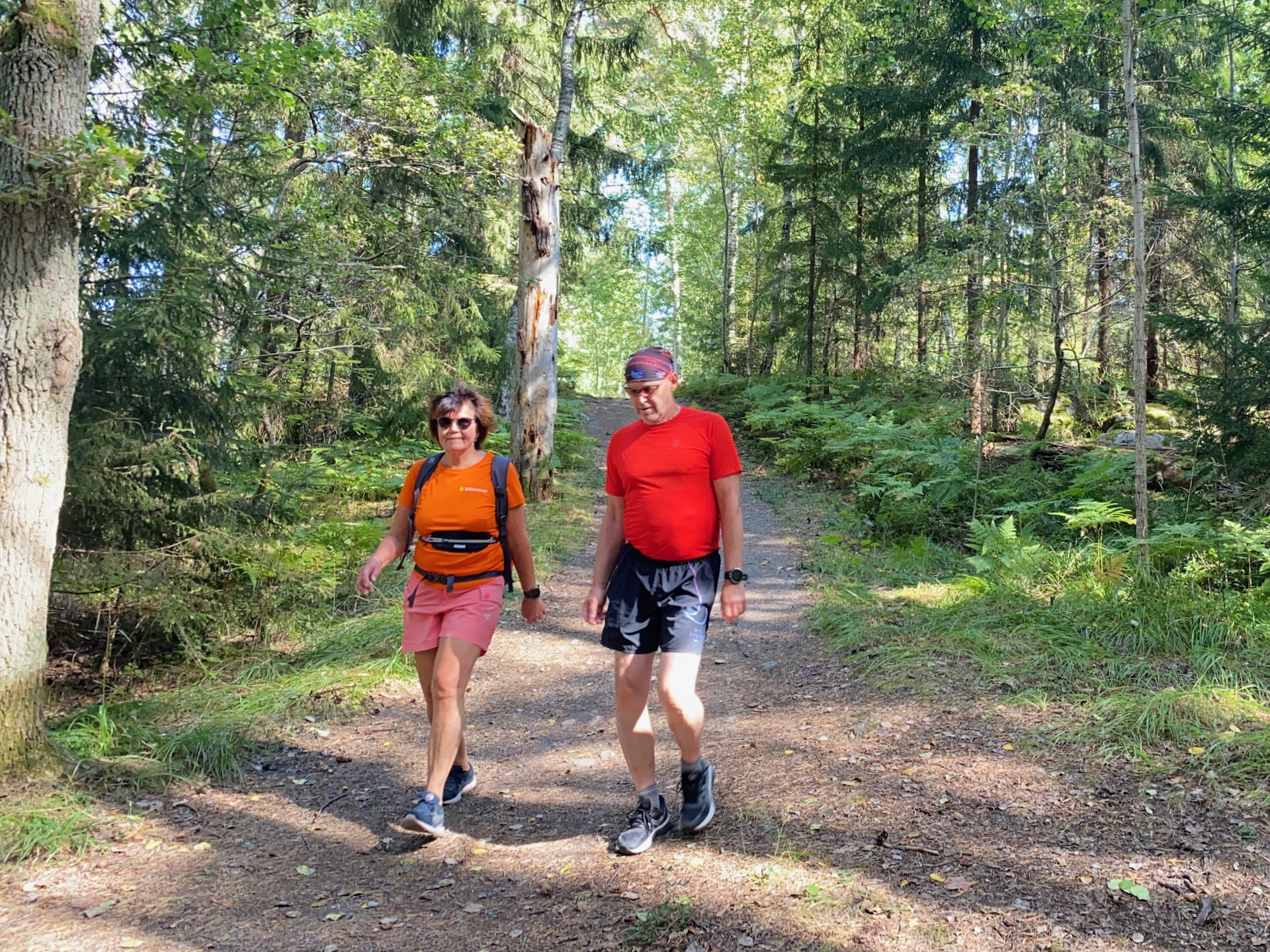 Löpningen är historia för min del numera, men på senare år har en idé om att promenera banan dykt upp. Den här veckan blev promenaden verklighet, passligt som ett 25-års jubileum. Det var inte självklart att jag/vi skulle klara av det. Den 30 kilometer långa banan går i kuperad terräng med några riktigt branta backar. Totala stigningen är 522 m! Oddsen att klara en 30-kilometers promenad var inte bra. Jag har numera två artrosknän som inte gillar ansträngning, speciellt inte att gå nerför. Som extrabonus fick jag dessutom hälsporre i sommar. Strategin var att starta och se, sedan avbryta om det blir för jobbigt. Knäna klarade utmaningen utan större bekymmer. Hälsporren var problemet, det gjorde rejält ont i hälen efter 10 km. Bilen stod färdigt parkerad vid 20 km, ifall om. Men jag tog en Burana till och vi segade oss igenom.