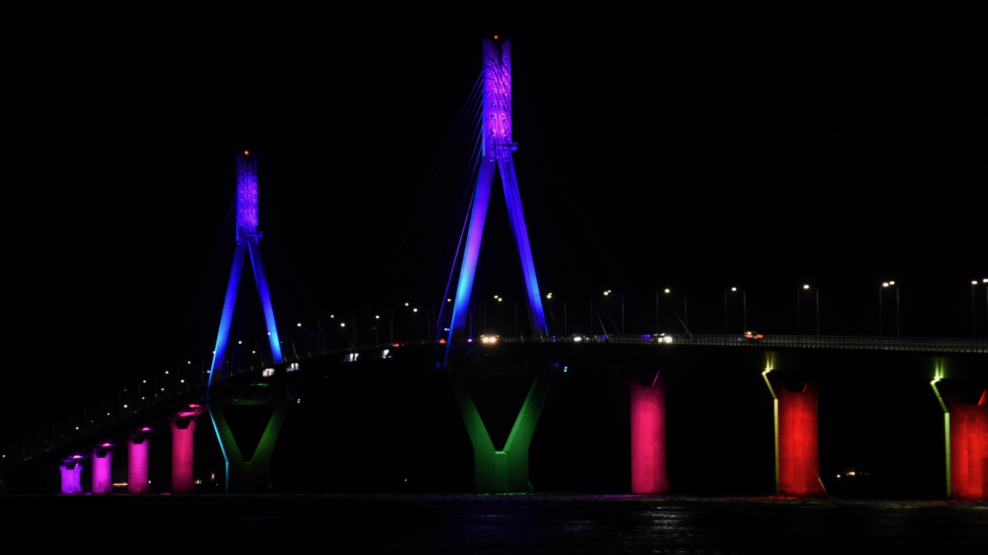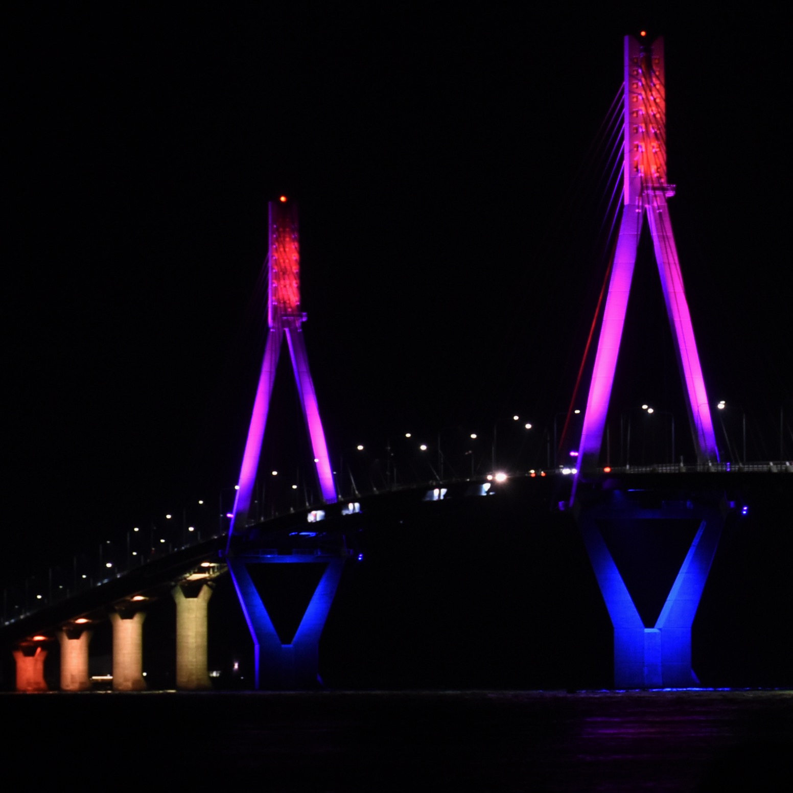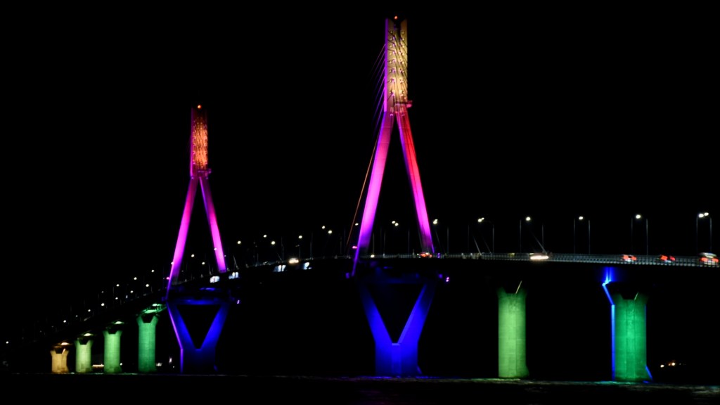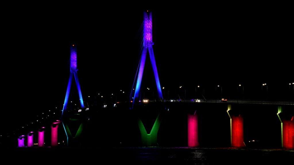 Hur som helst, det var invigning av den nya belysningen den 31 augusti 2024. Invigningen kallades Rainbow och bestod av några ljusshower där pylonerna och bropelarna upplystes i regnbågens alla färger. Antalet ljuspunkter är 76. En lågmäld men sevärd invigning skulle jag säga.