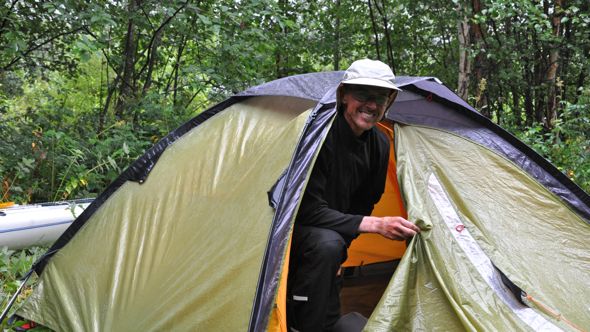 Efter en stunds sökande i tät haparandavegetation fann jag honom på gott humör vid älvmynningen. Han hade då hunnit spänna upp tältet som skydd för regnvädret och vilat en stund.