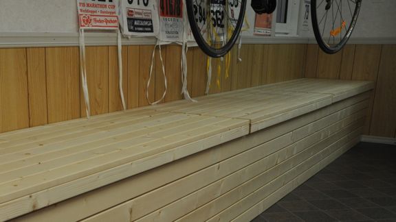 Jag snickrade till en bänk, modell större. Inte för att få mera sittplatser, utan för att få förvaringsutrymme. Nu blir det att trampa ner en massa skräp i bänken. Den är över fyra meter lång och rymmer mer än två kubikmeter.