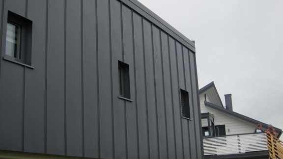 Plåt är bra till mycket men skall INTE användas som fasadmaterial! Inte i min föreställningsvärld, inte under några omständigheter!