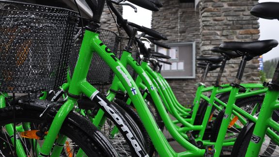 är en slogan som Levi centrum glädjande nog har hakat på. Ett konkret exempel är leviföretagarnas gemensamma anskaffning av 120 st vackert gröna hyrescyklar. Eller det heter väl lånecyklar i detta fall eftersom cykeln kan lånas för en dag helt GRATIS.