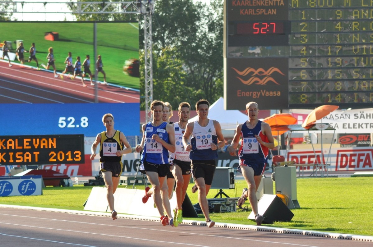 Kalevankisat03270713 Föregående Nästa Herrarna 800 m. Anders Lindal drar, Niclas Sandells på fjärde plats efter första varvet.