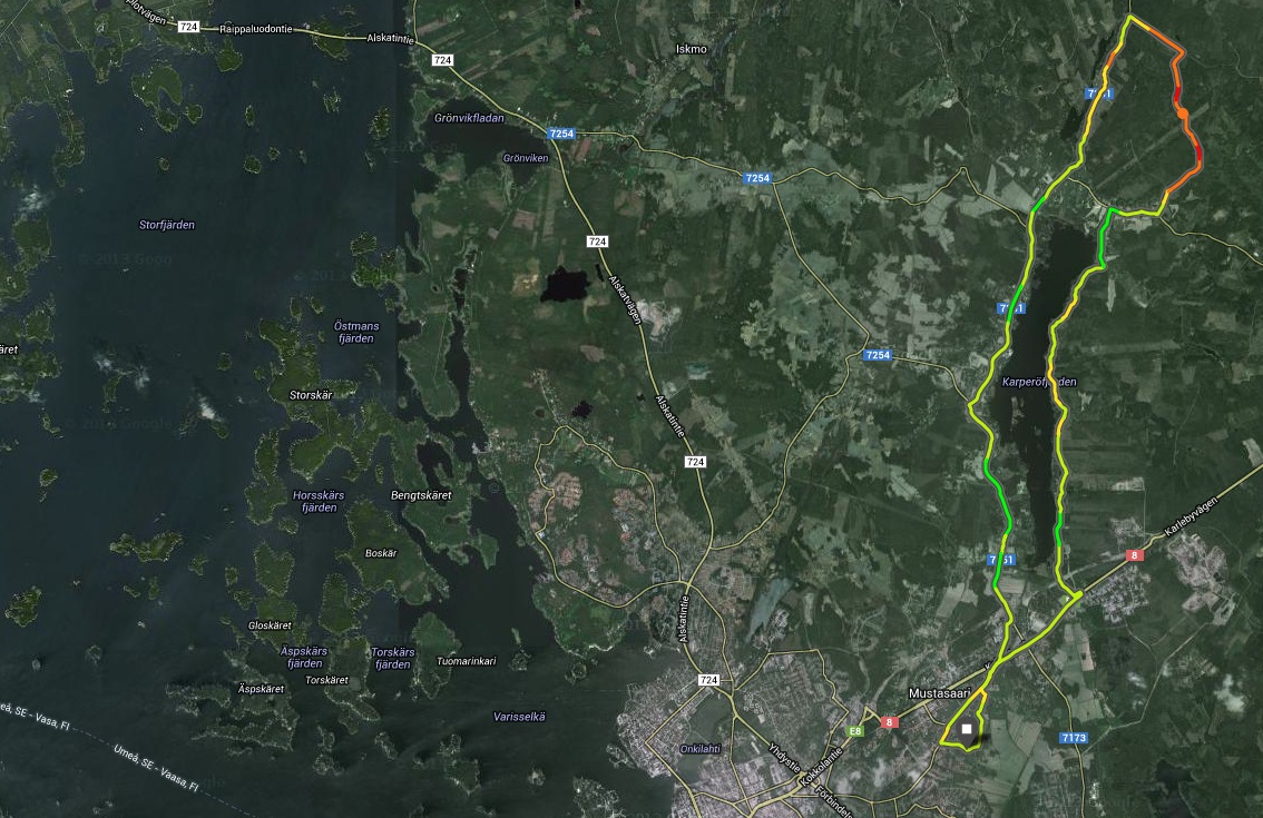Denna sensommardag bjöd på ett härligt väder. Solen sken från en klar himmel och kvicksilvret kröp över 20 grader. Jag tog en tur till Kuni och tillbaka. Men inte längs riksåttan utan till största delen genom skogen. Dagens rutt blev hemifrån, via Korsnäståget, Höstves, Storhälleberget, Båskas, Staversby, Miekka, längs Klumpvägen till Kuni där jag vände. Tillbaka längs Långträsk skogsväg, via Voitby, Båskas, Molnträsket, Skjutbanan, Fågelberget och hem. Det var kanske inte världens bekvämaste cykling på grund av grovt krossgrus men ändå en fin rutt. Nästan lite nostalgiskt att cykla mellan Kuni och Skatila. Det var där vi sprang Botniamarschen på 80-talet.