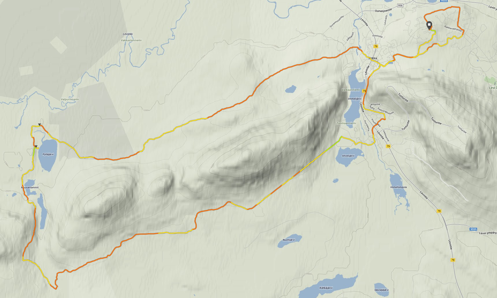 Eftersom utetemperaturen var någorlunda human vågade jag mig bort från hemknutarna och valde att skida Pyhänkierros. Två positiva överraskningar mötte. Spåret runt Pyhä var åter draget via Muusa. Dessutom var dragningen delvis ny och gick via Hanhipirtti vid den lilla sjön som likt många andra sjöar i Finland heter Pyhäjärvi. Och där hade jag aldrig tidigare varit.