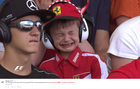 Men Kimi räddade ändå dagen för lillpojken. Bilden med den gråtande pojken uppsnappades av Scuderia Ferrari och stallet fixade till ett oväntat möte i depån. Efter en träff med idolen och ny mössa återfann sig livsglädjen. Kimi tillskrevs massor med kredits för den gesten.