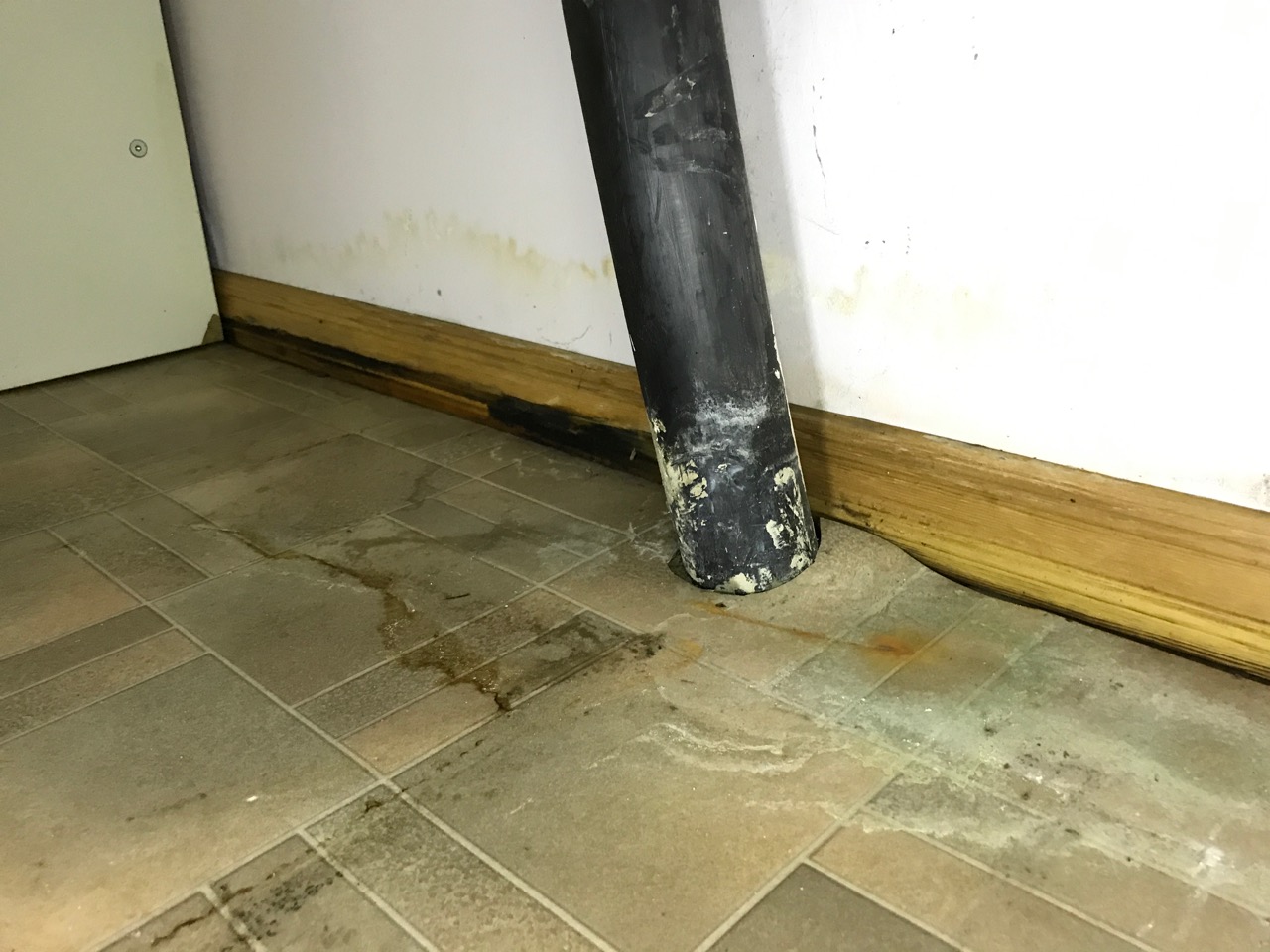 Det har antagligen pågått en längre tid. Det droppade lagom lite för att inte vattnet skulle rinna ut på golvet och bli upptäckt. I stället sökte det sig bakom golvlisten in i väggen och under mattan. Vattenskadan är nu ett faktum. Vi tvingas till en renovering av både förråd och badrum.
