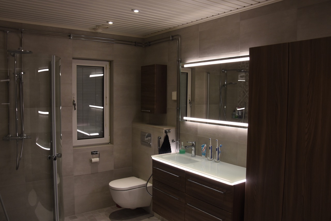 Min insats blev inte överdrivet stor denna gång. Förutom planeringen så gjorde jag det minimala elarbetet. Belysningen förnyades helt och just den biten är jag lite smånöjd med (läs helnöjd). Jag lyckades med konststycket att fälla in LED-armaturer i det befintliga taket utan att behöva riva. Operationen lämnade inga synliga spår och takbelysningen fungerar nu med både dimmer och närvarogivare. Nice!