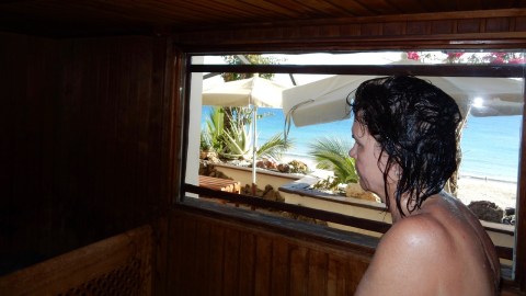 Den största överraskningen fick vi när vi upptäckte hotellbastun. Då handlar det inte om någon låtsasbastu, utan om en stor, äkta och ärlig finsk bastu utan krusiduller. I bastun finns ett panoramafönster med en fantastisk utsikt mot havet och stranden. En riktig strandbastu alltså! Bastukammaren var heller inte så dum. Den bjöd på en öppen vy mot havet.