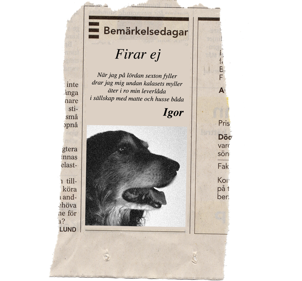 Någon enstaka gång kunde vi se att Igor deppade. Det var när vi tog fram resväskorna. Då förstod han genast att han inte fick följa med. Men de gånger vi tog fram kylväskan, visste glädjen inga gränser. Då var det hans tur! Glädjen över att få åka ut till sommarstugan gick inte att ta miste på. Något sommarstugeliv utan Igor har vi aldrig haft. Så det kommer sannolikt att kännas mycket annorlunda att åka dit utan honom.