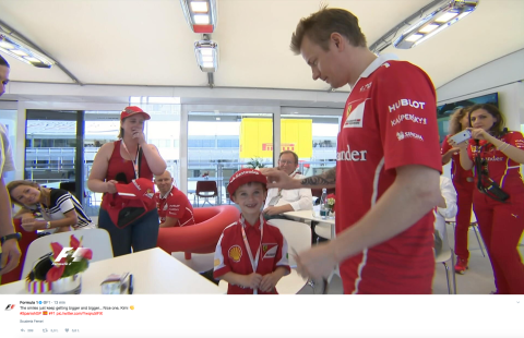 Men Kimi räddade ändå dagen för lillpojken. Bilden med den gråtande pojken uppsnappades av Scuderia Ferrari och stallet fixade till ett oväntat möte i depån. Efter en träff med idolen och ny mössa återfann sig livsglädjen. Kimi tillskrevs massor med kredits för den gesten.
