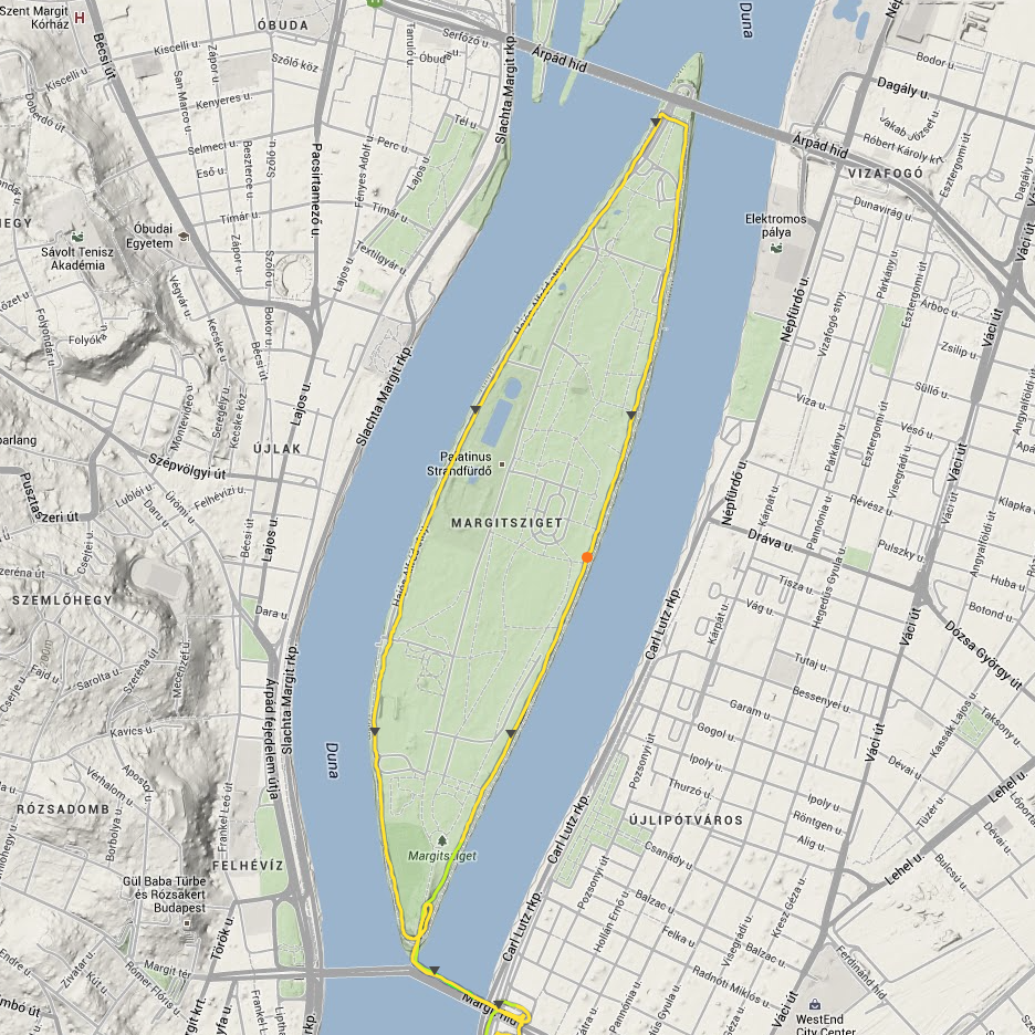 Motionsrunda på Margaretaön i Budapest. 5,2 km lång enligt Suunto Ambit. Underlag: Tartan.