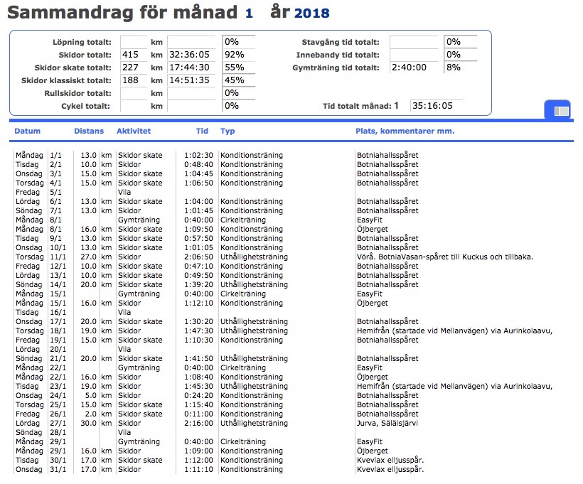 En sökning i motionsdagboken visar att årets januari månad är en av mina bättre någonsin under de drygt 20 år som jag motionsskidat. Eftersom jag inledde vintern med en olovligt dålig kondition satte jag som målsättning att inledningsvis skida många men korta länkar. Det upplägget lyckades tack vare ett utmärkt skidväder. Så tillsvidare är jag nöjd. Något kvitto på bättre kondition har inte ännu. Men jag hoppas ju.