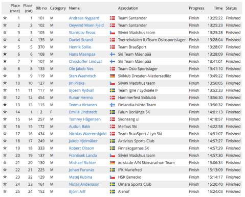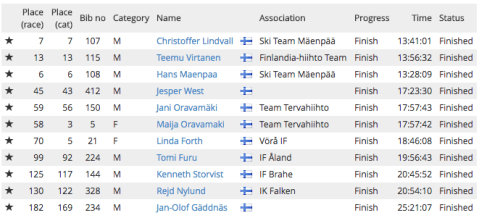 Åkarna i Team Mäenpää imponerade hela dagen genom att ligga i tätklungan och fick till slut fina placeringar. Ytterligare två åkare imponerade stort på mig. Den ena är Emilia Lindstedt, Falun Borlänge SK som skidade i mål endast 35 minuter efter segraren Andreas Nygaard. Den andra som gjorde intryck är Linda Forth, Vörå IF. Hon trotsade väder och vind, skidade i mål som sjunde bästa finländare på tiden 18:46. Ganska mycket pannben där!