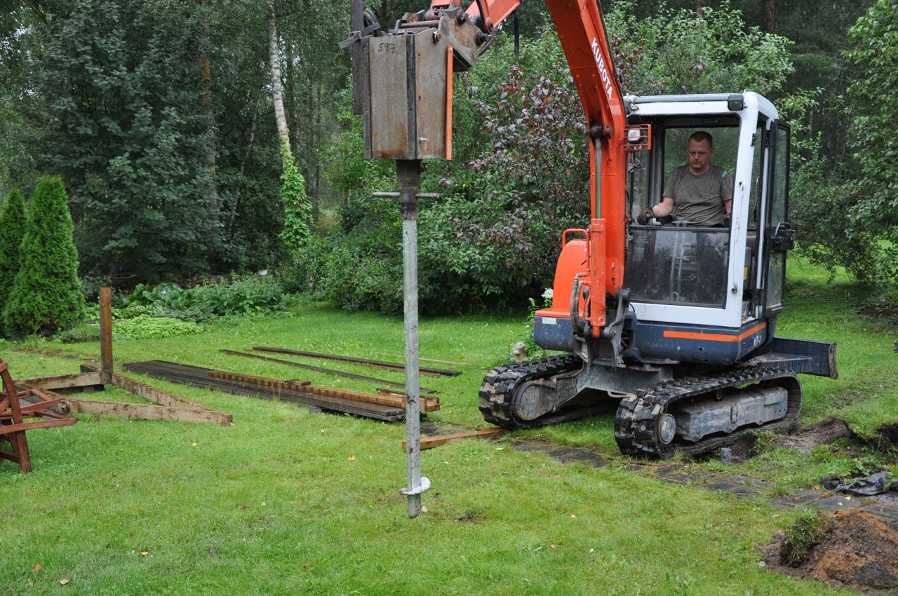 Jag är inte speciellt benägen att testa och prova på nymodigheter. I allmänhet är jag nog mer för gamla beprövade lösningar. När jag planerade terassbygget funderade jag en hel del på hur jag skulle göra grunden. Av bekvämlighetsskäl föll jag ändå till slut för en nyhet, nämligen skruvplint. Och visst var det bekvämt att stå och se på när maskinen skruvade ner 1,5 m långa plintar i marken.